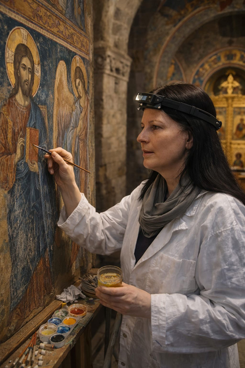 Discursul a fost completat de intervenția Ancăi Dină, președinte Art Conservation Support – ACS și specialist în restaurarea picturii murale, cu o experiență vastă în lucrul pe monumente emblematice din România, precum Sucevița, Moldovița și Voroneț. Abordarea sa a adus o dimensiune practică și contemporană discuției, evidențiind importanța conservării patrimoniului și provocările restaurării, dar și responsabilitatea profesioniștilor implicați în protejarea acestor mărturii ale istoriei și culturii românești. Detalii pe https://patrimonescu.ro/collections/restaurare-conservare